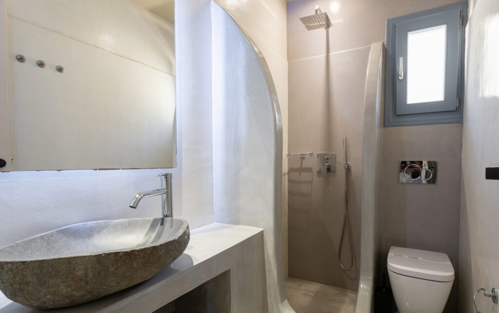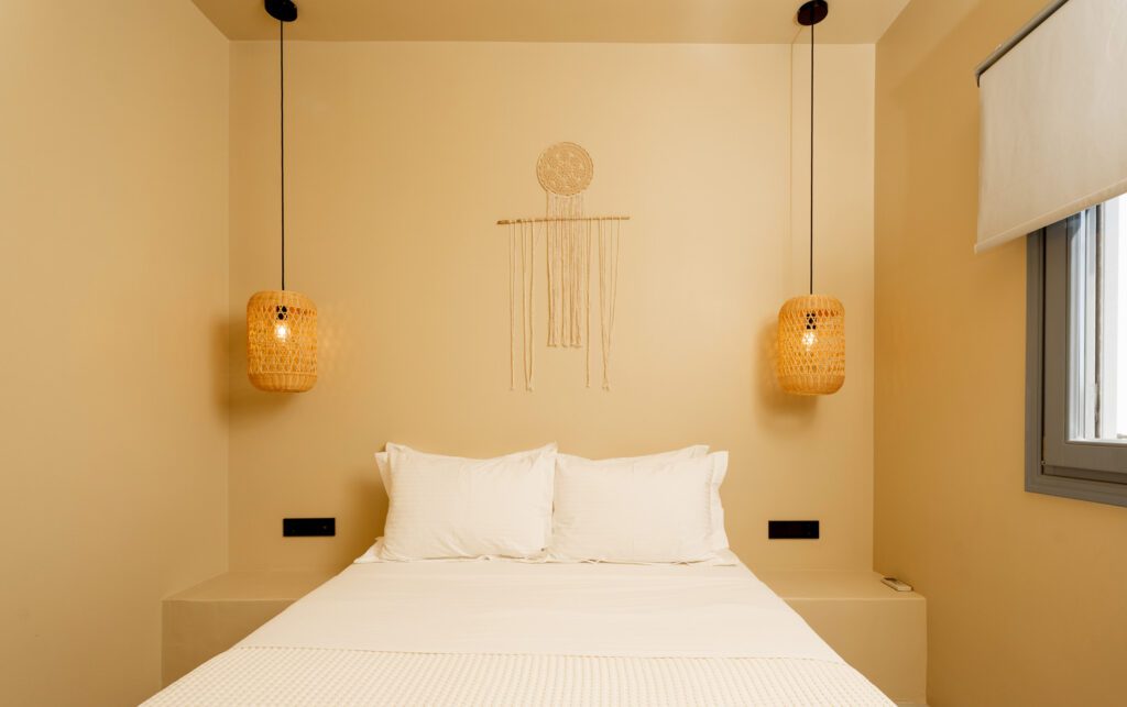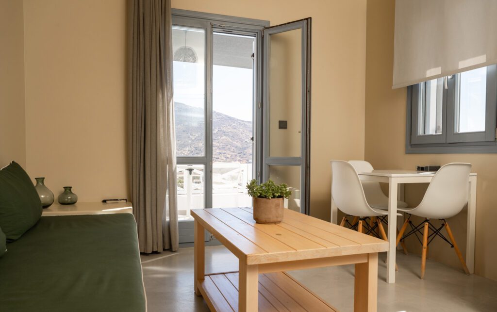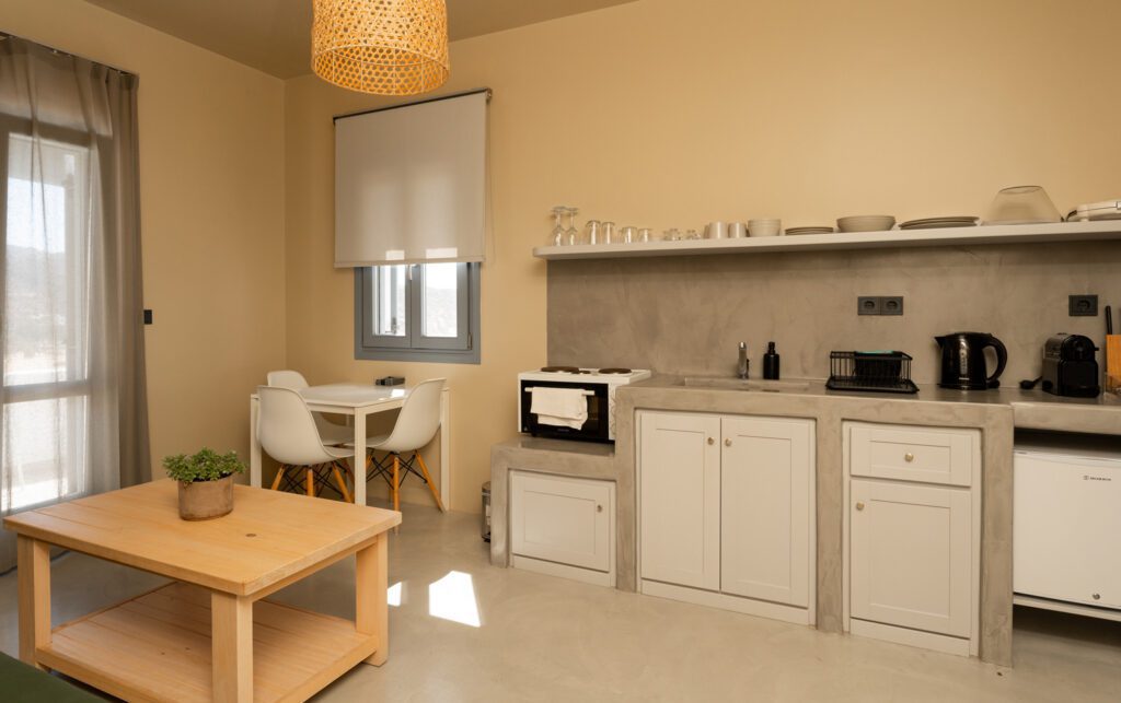 Τα διαμερίσματα είναι χτισμένα εξωτερικά με την παραδοσιακή κυκλαδίτικη αρχιτεκτονική. Εσωτερικά οι χώροι των 40 τ.μ, αποτελούνται από ένα αυτόνομο υπνοδωμάτιο με διπλό χτιστό κρεβάτι και ξεχωριστό σαλόνι, με ένα μονό καναπέ / κρεβάτι.